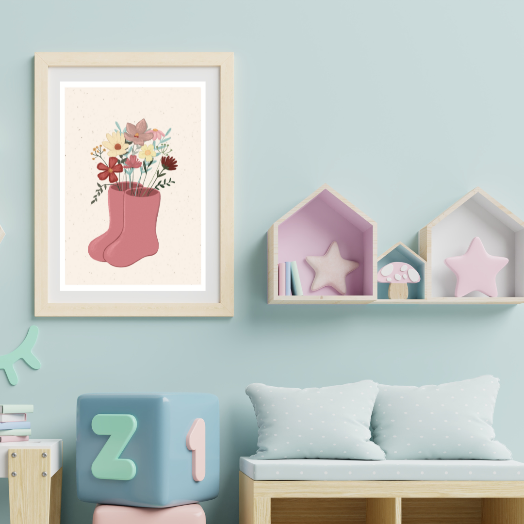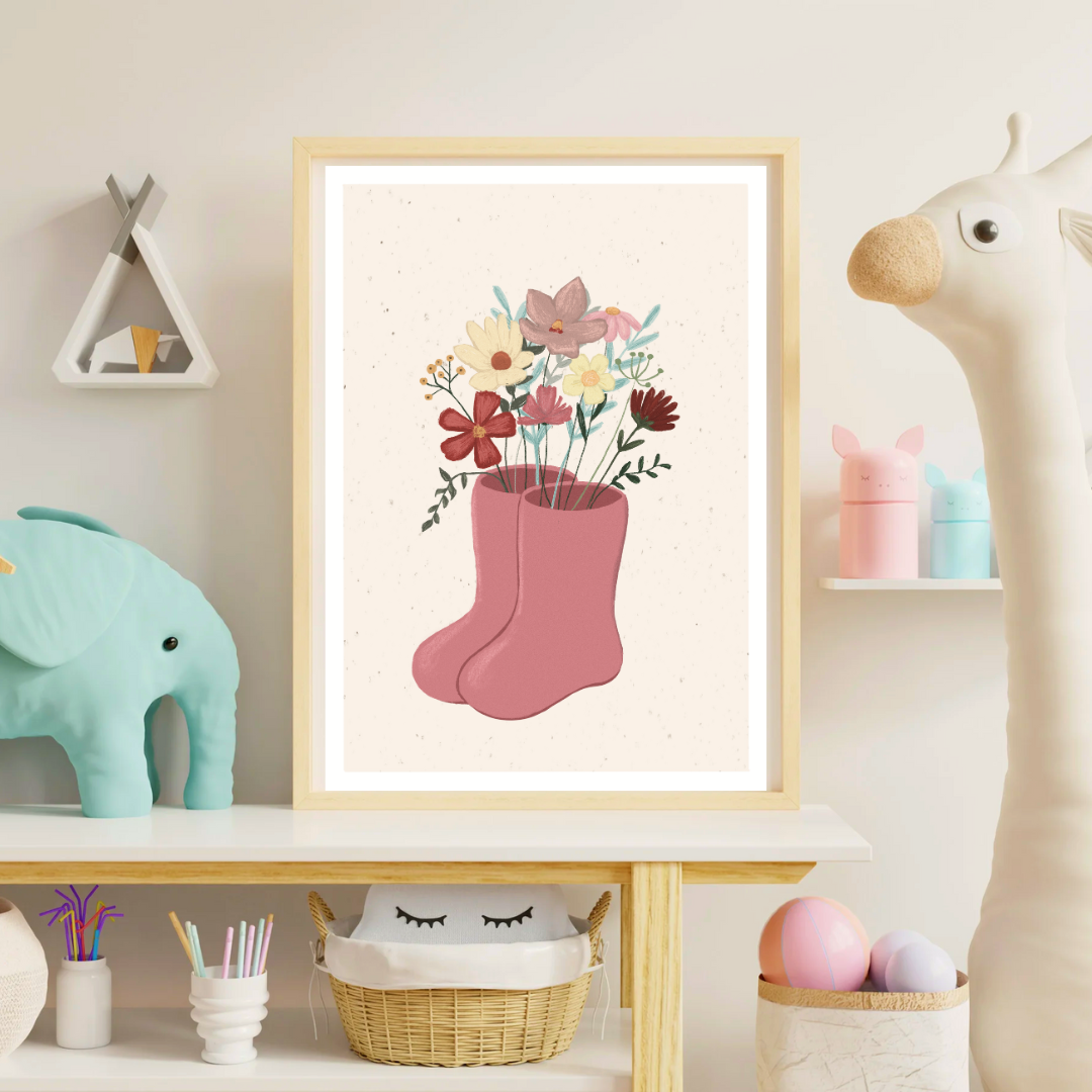 Bringe mit diesem liebevoll gestalteten Kunstdruck sanfte Farben und natürliche Eleganz ins Kinderzimmer! Die verspielte Illustration zeigt zarte Blumen, die aus kleinen Stiefeln sprießen – eine Kombination aus Märchenhaftigkeit und skandinavischem Charme.