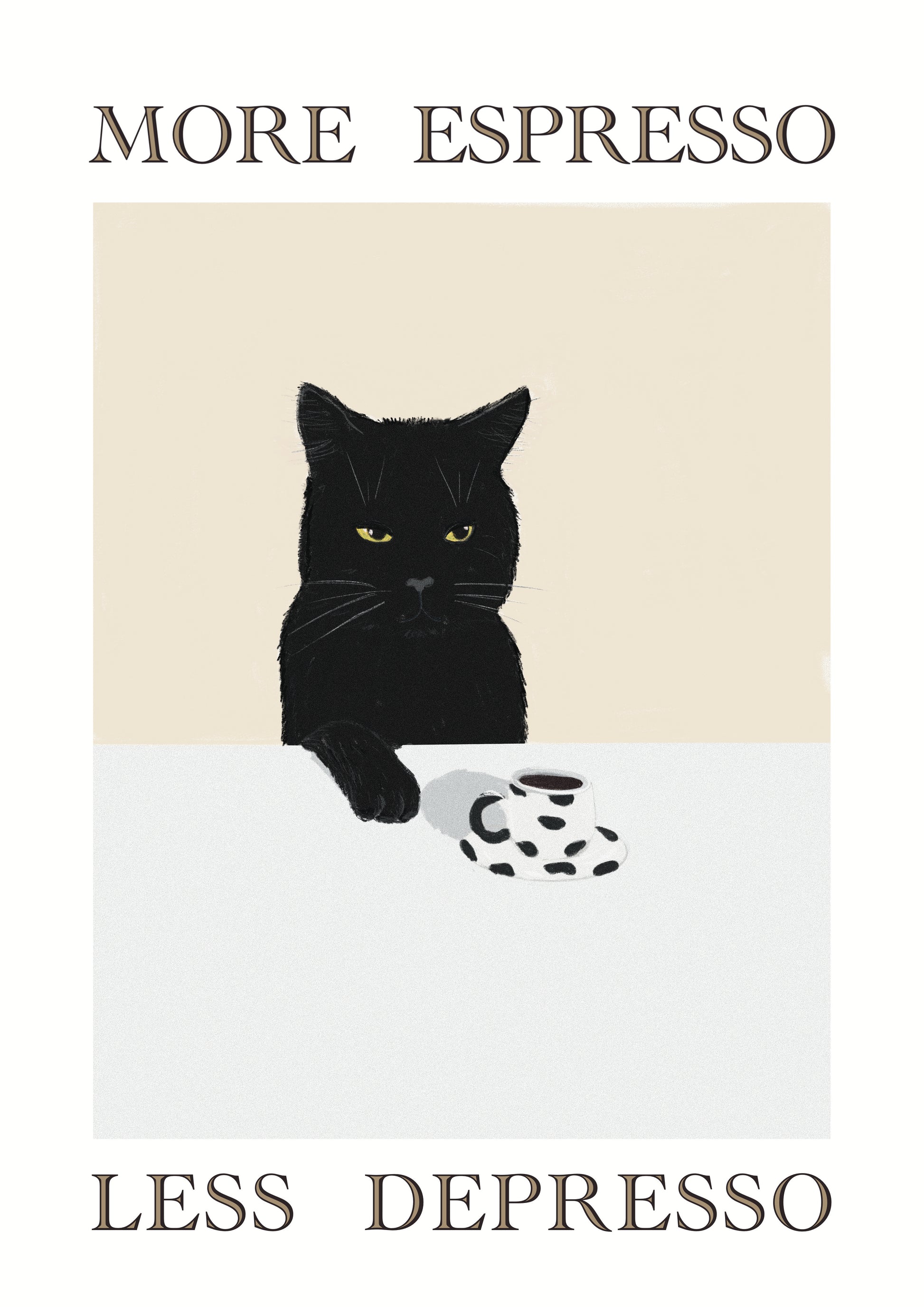 Startest du deinen Tag auch erst richtig nach einer Tasse Espresso? Dann ist dieser humorvolle Kunstdruck genau das Richtige für dich! Eine minimalistische Illustration einer lässigen schwarzen Katze mit Espresso-Tasse kombiniert mit dem witzigen Spruch „More Espresso, Less Depresso“ macht dieses Poster zum perfekten Hingucker für jede Küche, das Büro oder das Café.